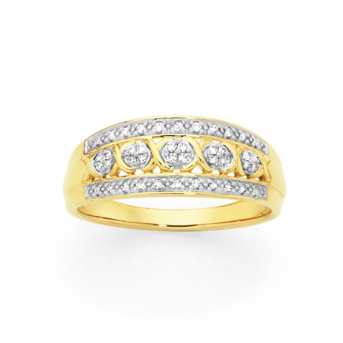 9ct Gold Diamond Round Brilliant Cut 5 Cluster Wide Swirl Band Total Diamond Weight=.10ct