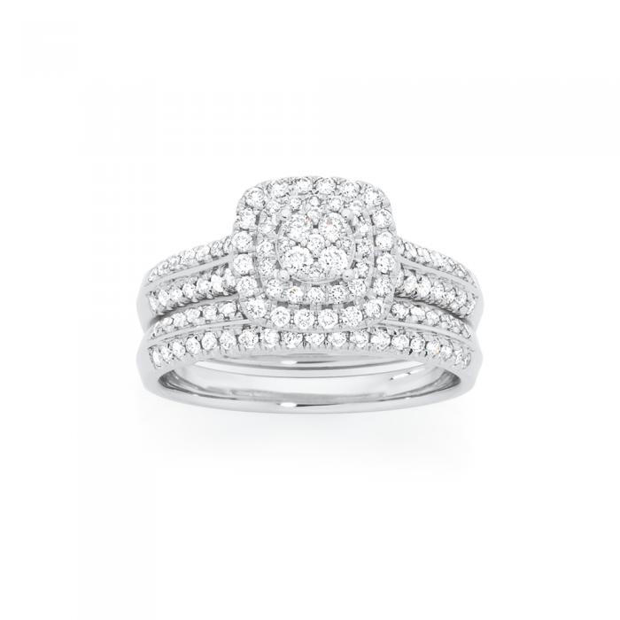 9ct White Gold Diamond Round Brilliant Cut Cluster Cushion Shape Shoulder Bridal Set Total Diamond Weight =.75ct