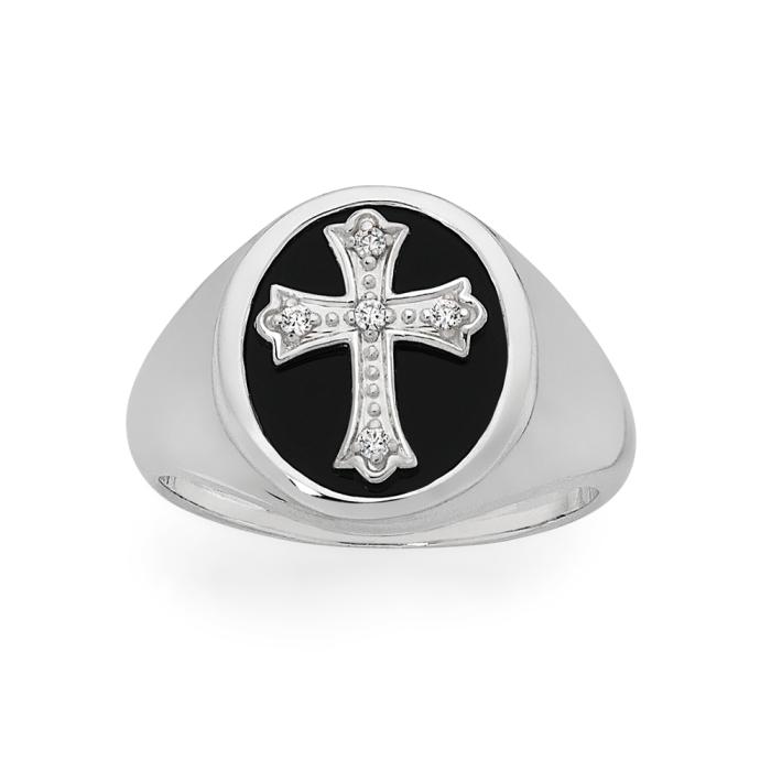 Sterling Silver Cubic Zirconia Fancy Cross Oval Black Agate Signet Ring - Available in Sizes U, W & Y