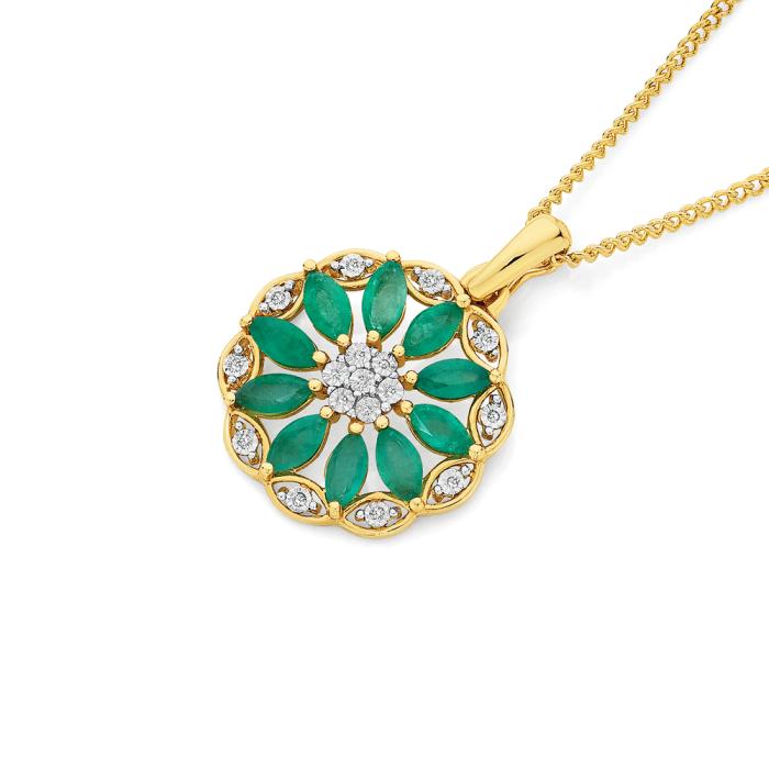 9ct Gold Emerald & Diamond Wreath Flower Pendant