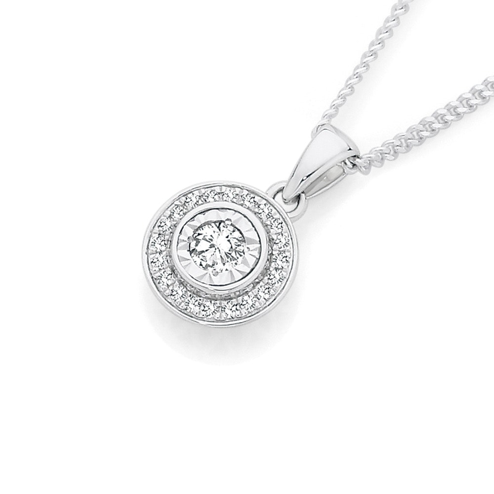 9ct White Gold Diamond Miracle Set Round Halo Pendant Total Diamond Weight =.15ct. Size = Approx. 13mm x 8mm Including Bale.