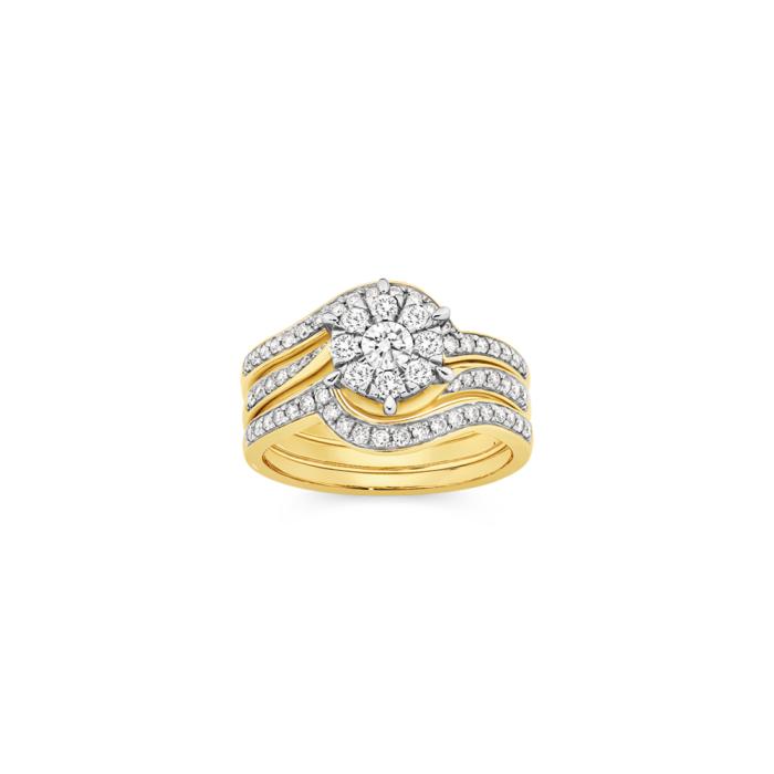 9ct Gold Diamond Round Brilliant Cut Cluster Swirl Three Piece Bridal Set Total Diamond Weight=.80ct