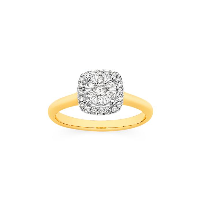 9ct Gold Diamond Round Brilliant Cut Cluster Cushion Shape Ring Total Diamond Weight=.34ct