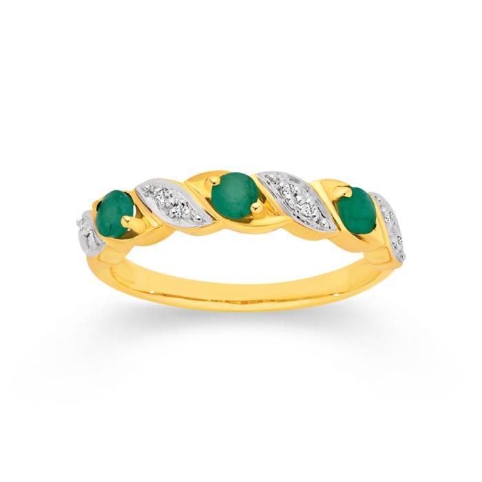 9ct Gold Natural Emerald & Diamond Round Brilliant Cut Twist Ring Total Diamond Weight =.05ct Natural Emerald = 3mm