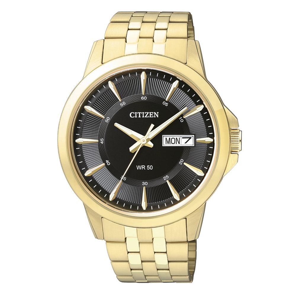 Citizen men's gold tone, black dial, luminous accents, date & 50m water resistant watch