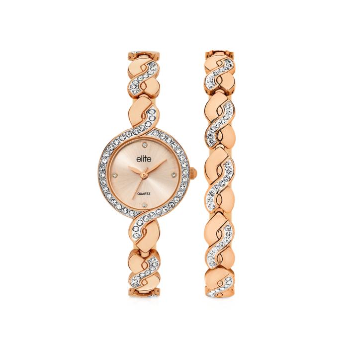 Where graceful curves meet brilliant sparkle. The Crystal Lattice Duo Set features a rose gold-tone watch and matching bracelet, designed with an elegant wave pattern accented by dazzling crystals for a luxurious, light-catching finish. The watch showcases a champagne dial framed by a crystal-studded bezel, exuding timeless elegance with every detail. Paired with the coordinating bracelet, this set offers a harmonious balance of sophistication and glamour, perfect for special occasions or refined everyday wear.
