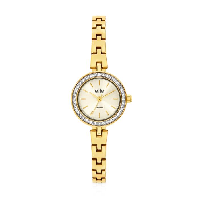 Delicate design meets radiant elegance in the Trellis. Crafted in a polished gold-tone finish, this timepiece features a slim, jewelry-inspired bracelet and a crystal-encrusted bezel that adds just the right touch of sparkle. The champagne dial is minimalist and refined, with slender gold-tone hands and hour markers that enhance its timeless charm. Lightweight and effortlessly chic, Trellis is perfect for dressing up your everyday look or adding a hint of glamour to special occasions.