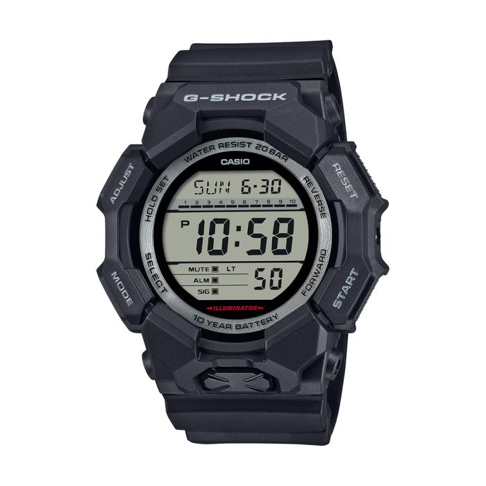 Enjoy a life of fewer battery changes with a large-case G-SHOCK with a 10-year battery you wont have to worry about for ages. The digital GD-010 delivers handy features like world time and stopwatch, as well as a high-brightness LED light, which can be easily accessed from the large button on front of the case, ensuring visibility even in the dark. Made with bio-based resin and equipped with a 10-year battery, this G-SHOCK is great if you want to reduce environmental impact. Available in a selection of black-based workstyle colour schemes for a cool design that moves with ease from casual settings to work situations.