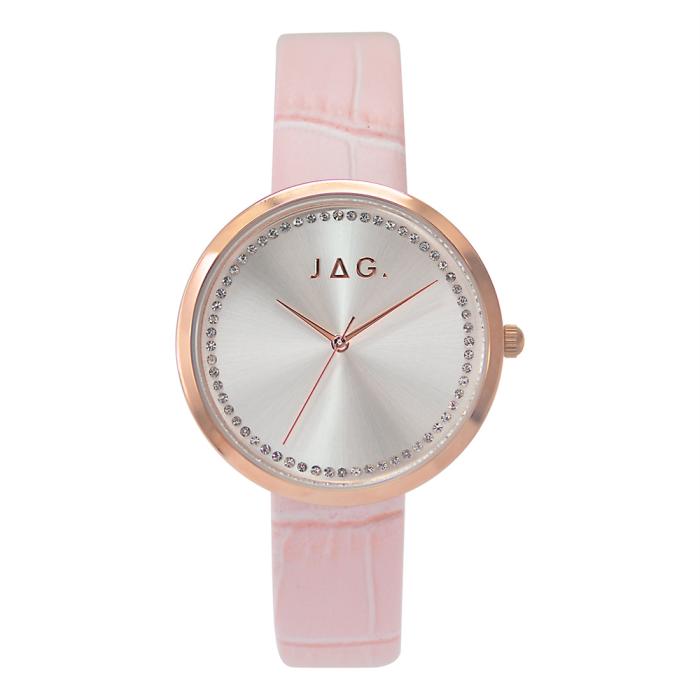 Jag Tegan features a fashionable stone-set dial with a pink leather strap, creating an elegant style.