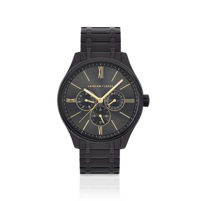 Always be on time with this stylish and sleek Laidlaw + Leeds multifunction watch. This timeless masterpiece adds a touch of sophistication to your attire, featuring a black tone stainless steel case and strap with stunning gold tone indexes.