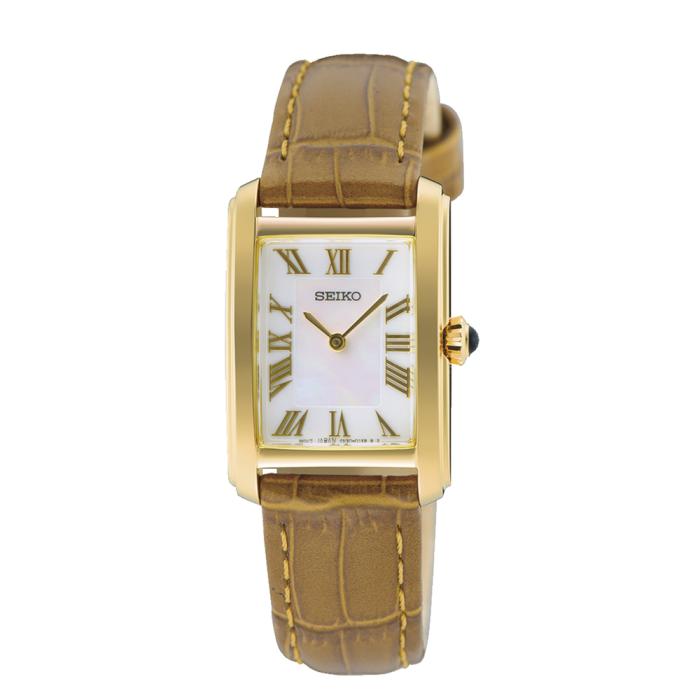 Seiko ladies gold tone, square mother of pearl dial, roman numeral, brown leather strap & 50m water resistant watch The Seiko SWR100P is a sophisticated and timeless ladies watch, featuring a delicate mother-of-pearl dial adorned with elegant Roman numerals for a soft, luxurious look. Powered by Seikos reliable Calibre 4N30 quartz movement, it delivers precise and consistent timekeeping. Housed in a sleek 22.2mm gold rectangular case with curved Hardlex crystal, this watch combines classic design with subtle modern detailing. A light brown leather strap adds both comfort and style, while 50 metres of water resistance make it suitable for everyday wear. The SWR100P is a beautifully refined timepiece that complements any outfit with effortless elegance.