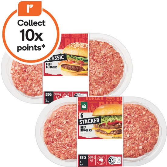 Woolworths Australian Beef Burgers Classic or Stacker 500g