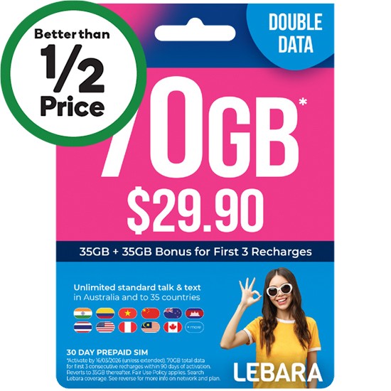 ||For use in AU. 35GB + 35GB for first 3 consecutive recharges, reverts to 35GB thereafter. Activate by 16/3/26 (unless extended). New customers only. Up to 200GB of unused data can be rolled over to next month when recharged with an eligible plan before expiry. Visit lebara.com.au/mobile-plan/medium-sim/ for full list of countries included in your plan. T&C apply. Lebara $29.90 Starter Pack offer ends 3/2/26.