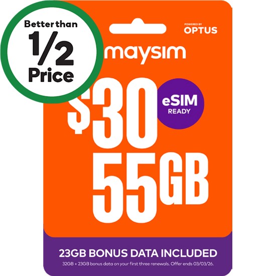 °Terms and Fair Go policy apply. New services with 4G/5G compatible devices only. For use in Australia. Limit 3 per customer. Download speed caps apply. 5G available in selected areas (excl NT) with a compatible device. See amaysim.com.au/about/coverage. eSIM requires an eSIM compatible device. See amaysim.com.au/international/calls for full list of countries with unlimited international talk and text. Promo prices valid for first renewal only for amaysim $30 and $150 Starter packs purchased between 04/02/26 to 03/03/26, $40 Starter packs purchased between 11/02/26 to 24/02/26 and $50 Starter packs purchased between 04/02/26 to 17/02/26. Activate the $30, $40, or $50 Starter pack by 03/03/26 to get bonus data for first 3 renewals when you renew on or before your renewal date. Bonus data not available with any other offer and not exchangeable or redeemable for cash. Ongoing is $30/28 days/32GB, $40/28 days/80GB, $50/28 days/120GB, $150/182 days/150GB. $30, $40 and $50 Starter packs autorenew every 28 days. $150 Starter packs auto-renew every 182 days. Inclusions when you choose $30 UNLIMITED plan, $40 UNLIMITED plan, $50 UNLIMITED plan or $150 UNLIMITED plan. See amaysim.com.au/30, amaysim.com.au/40, amaysim.com.au/50 and amaysim.com.au/150 for details. See amaysim.com.au/terms for full terms and policies. While stocks last.