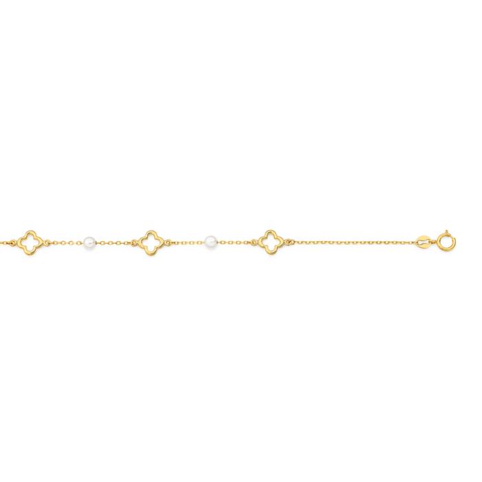 9ct Gold 19cm Hollow Open Clover Bracelet with Cultured Freshwater Pearls. Approximate Length = 17cm with 2cm extension.