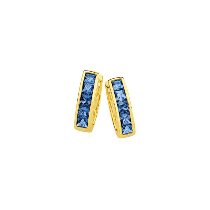 9ct Gold Created Sapphire Princess Cut Channel Set Huggie Earrings, Created Sapphire Stone Size = 3mm. Approximate inner diameter 10mm Width x 13mm Height