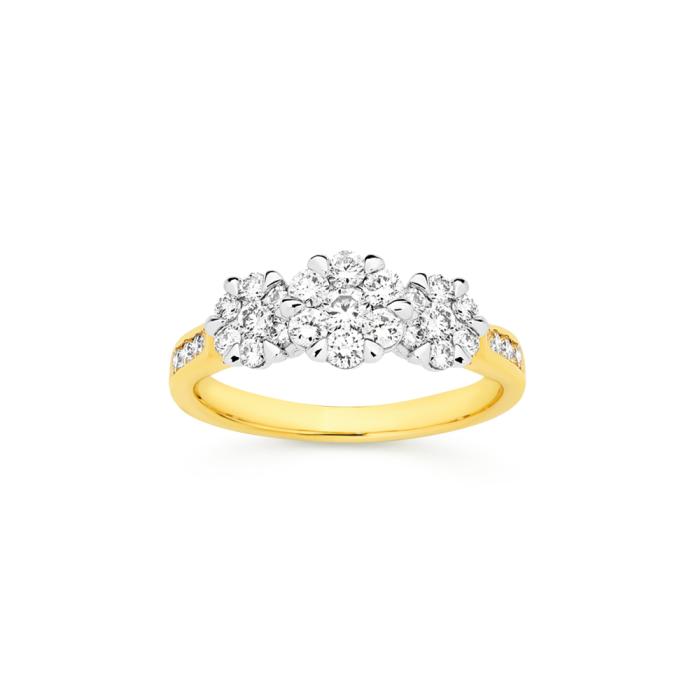 9ct Gold Diamond Round Brilliant Cut Cluster Trilogy Ring with Channel Set Shoulders Total Diamond Weight=.75ct