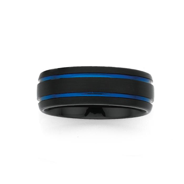 Tungsten Carbide Matte Double Blue Lines Gents Ring in Size Z. Approximate Dimensions: 8mm. 'Tungsten' is derived from a Swedish phrase meaning 'heavy stone' in honour of its weight and strength. On its own tungsten is brittle but when chemically bonded with other elements it becomes 'Tungsten Carbide' which is then a metal alloy with superior strength, hardness, and durability. It rates 9 on the 'Mohs' scale of mineral hardness (with 10 being the hardest), it is 3 times harder than titanium and cobalt chrome. All designs are 'comfort fit' with no sharp edges. They will not rust or tarnish, maintaining the polished finish for many years to come. Can be ordered in sizes S to Z+2 instore only.