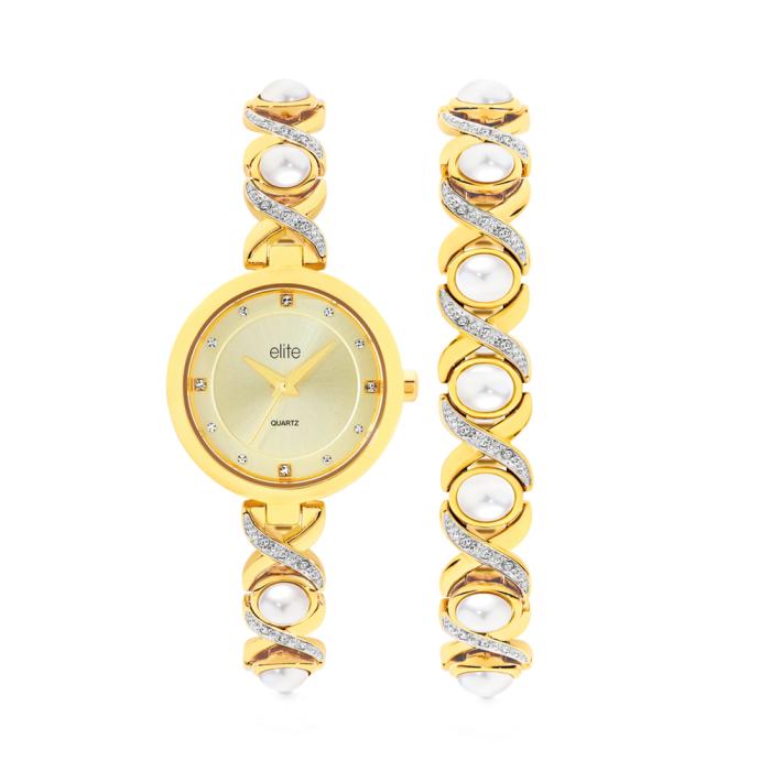 Elite Ladies Cross Pearl Luster Watch & Bracelet Set