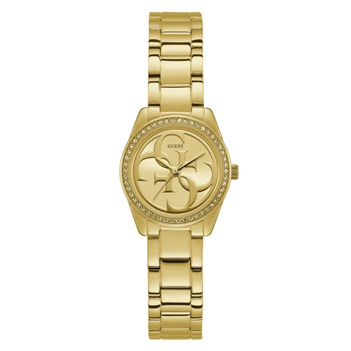 This new?timepiece from GUESS features a 28mm sunray champagne logo dial enriched with a row of crystals and gold tone polished stainless steel strap, making it an easy transition from day into night.