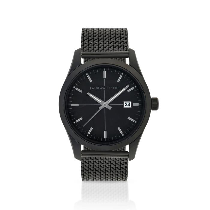 This casual dress watch is perfect for everyday wear. Sleek and minimalistic, this watch is sure to complement any outfit. Featuring a black tone stainless steel case and mesh bracelet, echoed by a black dial.