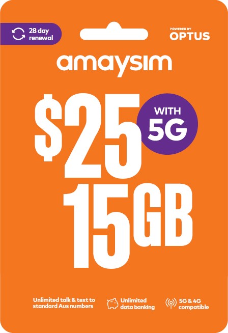 Terms and Fair Go policy apply. New services with 4G/5G compatible devices only. For use in Australia. Limit 5 per customer. 5G available in selected areas (excl. NT) with a compatible device and plan. See amaysim.com.au/about/coverage. eSIM requires a compatible device. Unlimited Data Banking applies while you stay on the same plan. See amaysim.com.au/international/calls for the full list of countries with unlimited talk and text.