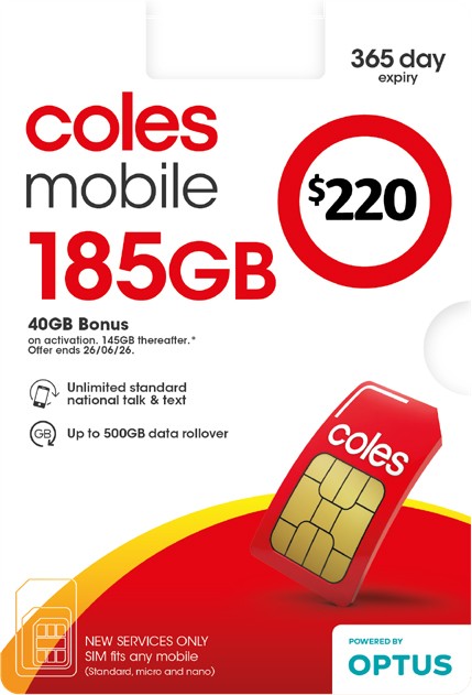 Coles Mobile $220 SIM: Bonus data offer ends 26/6/26. Activation required by 30/6/26 to get 40GB bonus data for first renewal, thereafter standard data inclusions apply.