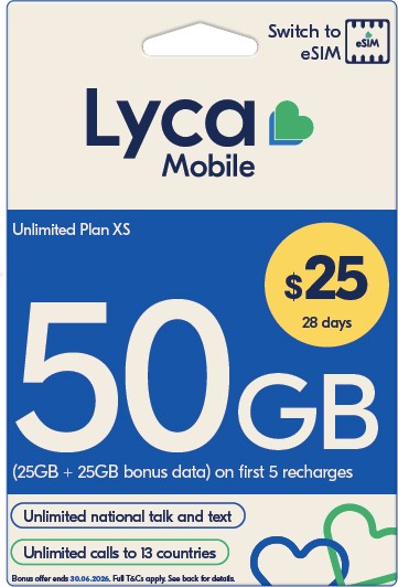 Lyca $25: 50GB/28days (25GB + 25GB bonus data) on activation and next 4 autorenewals for new customers are valid until 30/06/2026. Ongoing 25GB/28 days.
