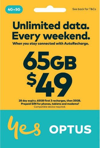 Optus $49 SIM: Third recharge within 90 days of activation, 35GB data from fourth recharge, or as notified.
