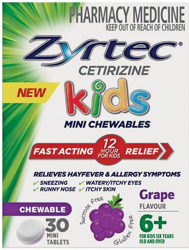 Zyrtec Cetirizine Kids Mini Chewables 6+ Years Grape Flavour 30 Mini Tablets