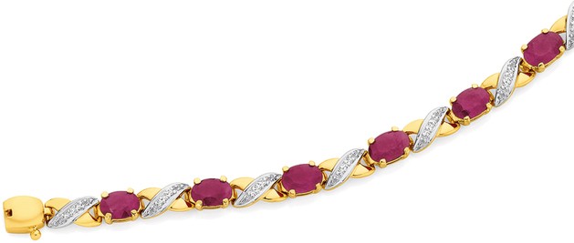 9ct Gold Oval Cut Natural Ruby Kiss Bracelet with 16 Points of Diamonds, Bracelet Length 19cm with Lock