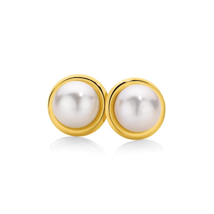 9ct Gold Cultured Freshwater Pearl Button 8mm Polished Frame Stud Earrings