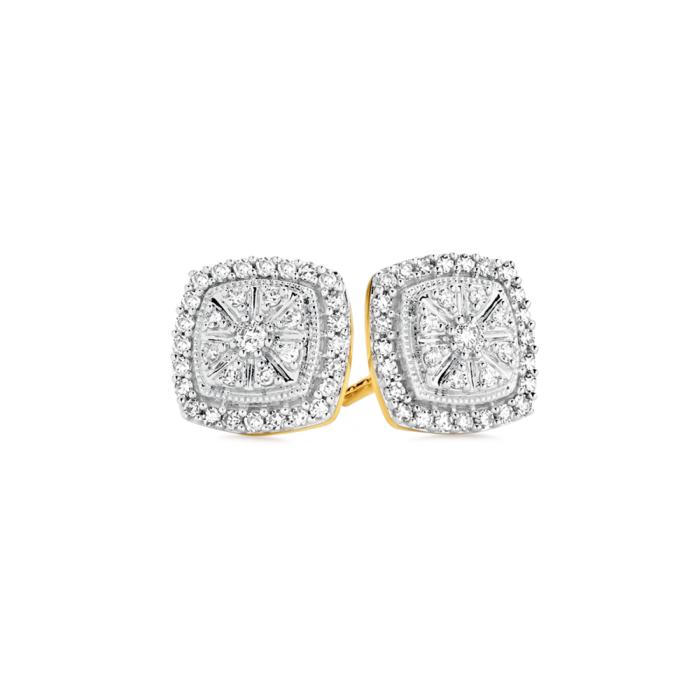9ct Gold Diamond Round Brilliant Cut Cluster Cushion Shape Stud Earrings Total Diamond Weight=.25ct. Size = Approx. 8mm x 8mm.