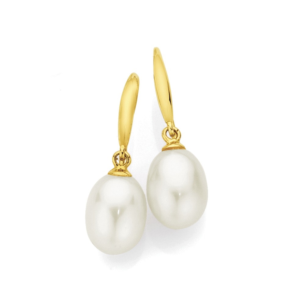 9ct Gold 8mm Cultured Fresh Water Pearl Shepherd Hook Drop Earrings, Approximate Length (including hook) = 25mm