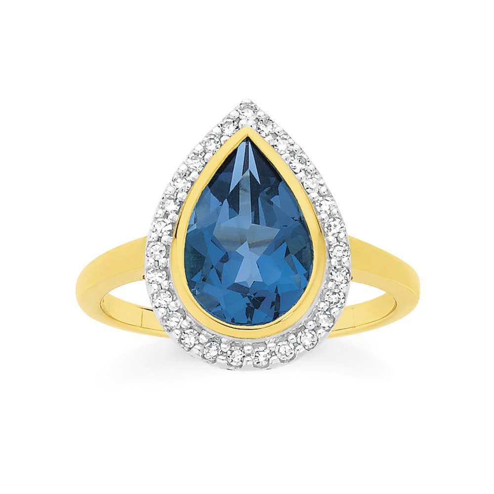 9ct Gold London Blue Topaz Pear Cut Bezel Set Framed Ring with 20 Points of Diamonds, London Blue Topaz Stone Size = 12x8mm