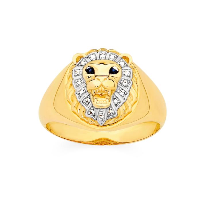 9ct Gold Natural Sapphire Eyes with 5 Points of Diamonds Lion Head Ring. Available in Sizes U, W, Y.