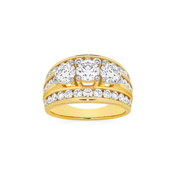 Alora 10ct Gold Lab Grown Diamond Round Brilliant Cut Three Row Trilogy Band Total Weight = 3.00ct. This Ring comes in Size P and R.
