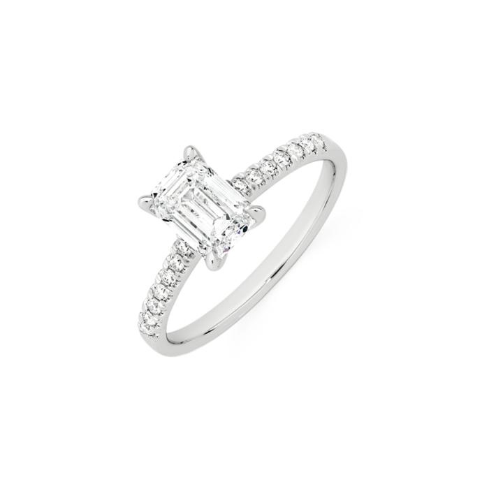 Alora by Angus & Coote 14ct White Gold Lab Grown Diamond Ring Emerald Cut Solitaire Featuring a 1 1/2 Carat Certified Centre Stone with Round Brilliant Cut Claw Set Shoulders Total Weight = 1.65ct.