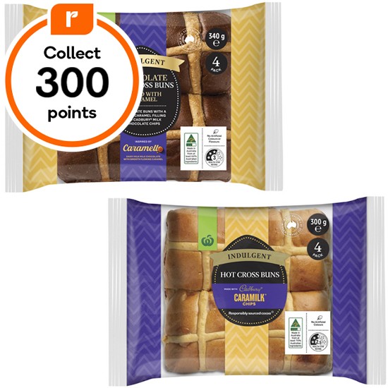 Woolworths Indulgent Hot Cross Buns made with Cadbury® Caramilk® Chocolate Chips Pk 4 or Woolworths Indulgent Caramel Filled Chocolate Hot Cross Buns, inspired by Cadbury® Caramello® Pk 4^