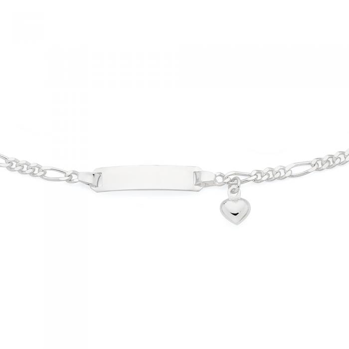 Italian Made Sterling Silver 16.5cm Solid Figaro 3+1 Heart Charm Engravable Identity Ki's Bracelet. Approximate Dimensions - 16.5 Length.