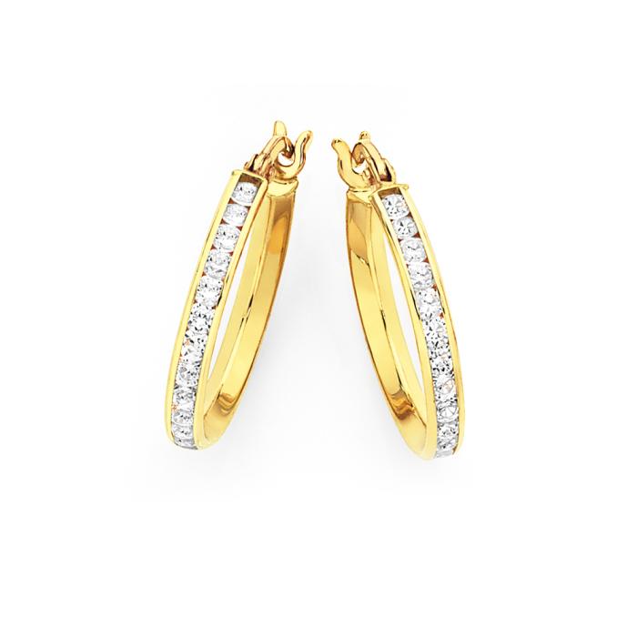 9ct Gold Round Brilliant Cut Cubic Zirconia Channel Set Hoop Earrings. Approximate Dimensions = 2mm (Width) x 13mm (External Diameter).