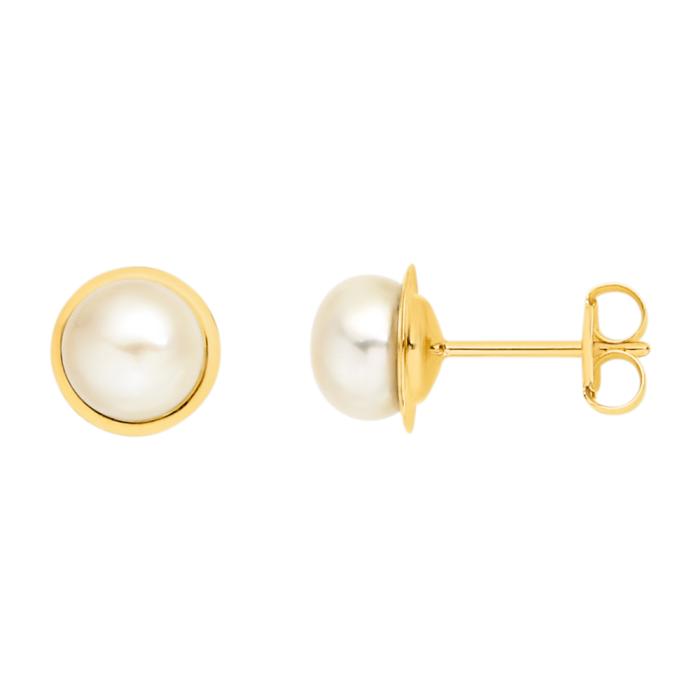 European Made 9ct Gold Button Cultured Freshwater Pearl Gold Framed Stud Earrings Pearl Size = 5.5mm.