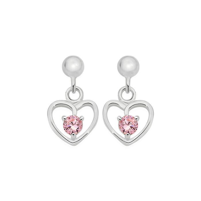 Sterling Silver Pink Cubic Zirconia Open Heart Drop Stud Kid's Earrings.