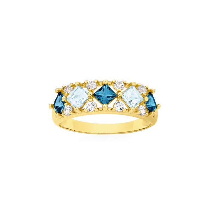 9ct Gold Angled Princess Cut London Blue Topaz & Sky Blue Topaz with Round Brilliant Cut Sky Blue Topaz Dress Ring.