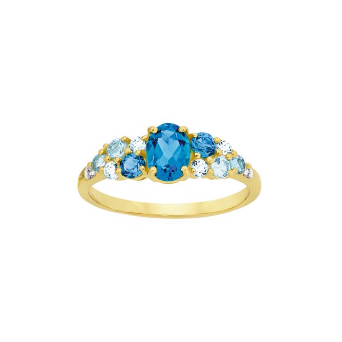 9ct Gold Oval Cut London Blue Topaz Centre Stone with Round Billant Cut London Blue Topaz, Sky Blue Topaz & Diamond Multi Swirl Dress Ring. London Blue Topaz Centre Stone Size = 7x5mm.