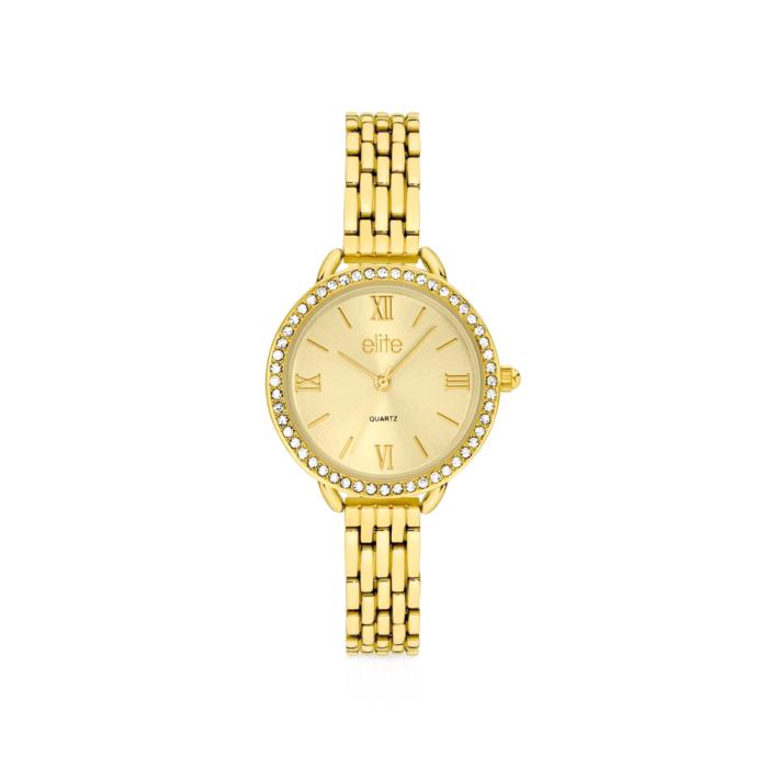 Radiate timeless elegance with Adaline, a dazzling gold-tone watch that brings classic charm into the modern moment. Its sun-brushed gold dial, adorned with Roman numeral hour markers, creates a look thats both refined and radiant. Encircled by a ring of sparkling crystals and paired with a polished multi-link bracelet, Adaline is more than just a timepiece its an everyday statement of sophistication. Lightweight yet eye-catching, it's the perfect accessory for everything from boardrooms to brunch dates.