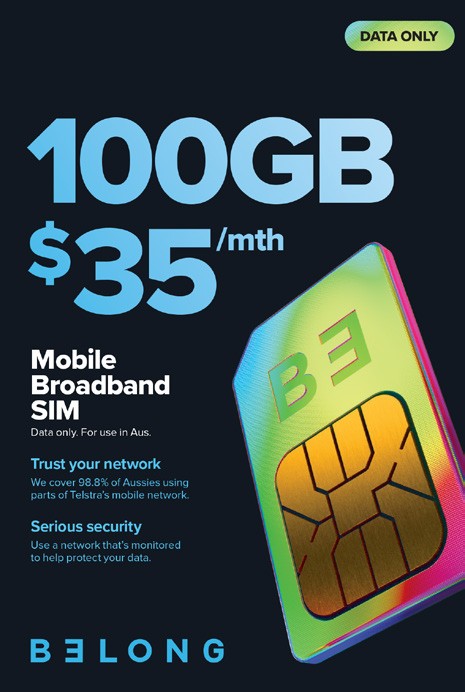 Mobile Broadband: This is a data-only SIM plan. Calls and texts are not included. Limit: Total of 3 Belong SIMs per customer. 4G and 5G download speeds capped at 150 Mbps. For personal use only. Telstra FairPlay Policy applies.