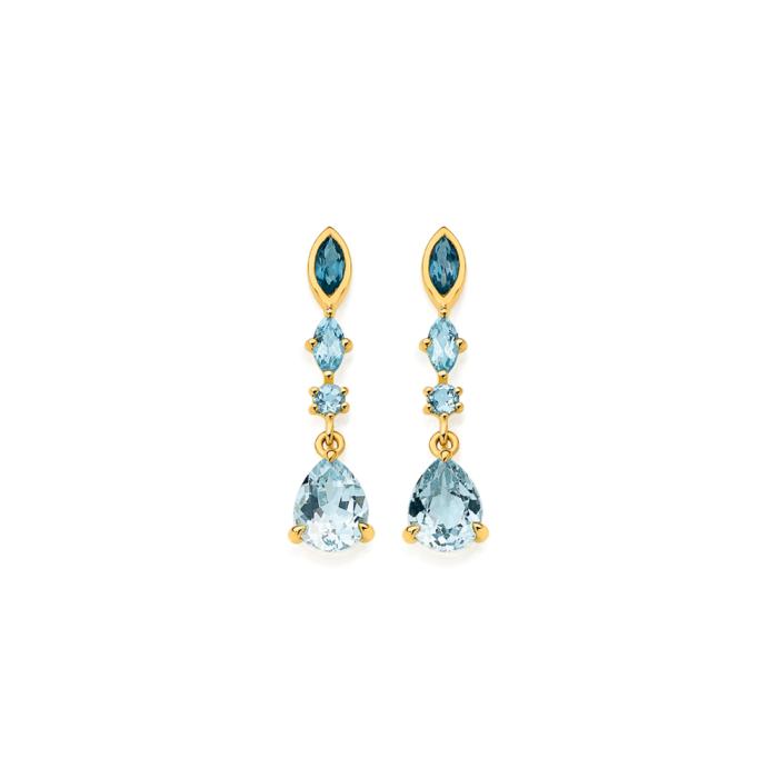 9ct gold stud earrings featuring a 8x6mm pear-cut sky blue topaz, a round brilliant-cut light Swiss blue topaz, marquise-cut Swiss blue topaz and a London blue topaz. Approximately 25mm in length.