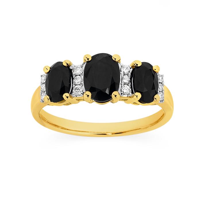 9ct Gold Black Sapphire & Diamond Oval Trilogy Ring Total Diamond Weight =.10ct. Sapphire Stone Size - Centre Stone = 7x5mm, Side Stones = 6x4mm.