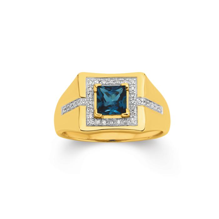 9ct Gold Diamond & London Blue Topaz Gents Ring